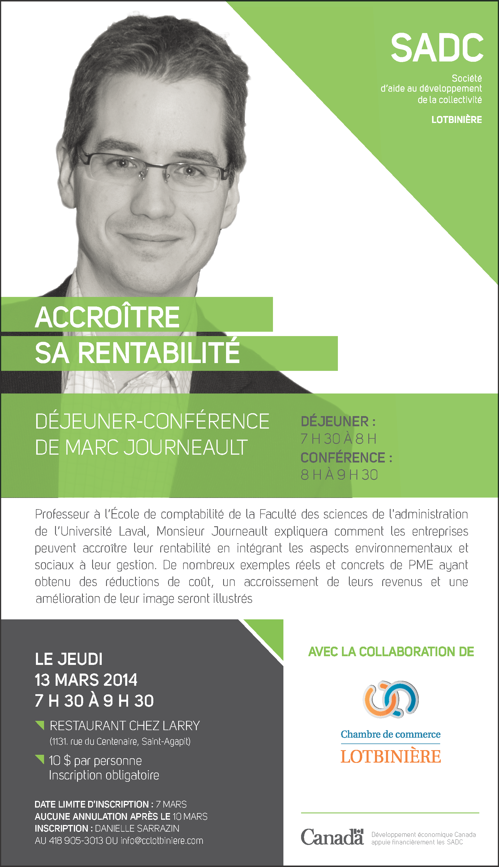Accroître sa rentabilité: Ce déjeuner-conférence, offert le 14 mars 2015, a permis d’expliquer comment les entreprises peuvent accroître leur rentabilité en intégrant les aspects environnementaux et sociaux à leur gestion. Des exemples concrets de PME ayant obtenu des réductions de coûts, un accroissement de leurs revenus, et une amélioration de leur image ont été présentés.