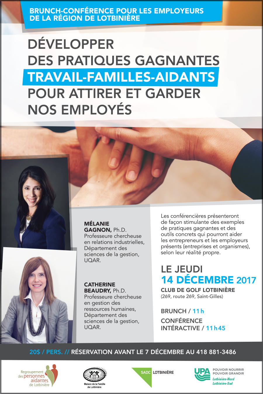 Club de Golf Lotbinière 269, route 269, Saint-GillesDévelopper des pratiques gagnantes travail-familles-aidants pour attirer et garder nos employés 20$ par personne (brunch inclus) Réservation avant le 7 décembre au 418 881-3486 Plus d'information en ICI
