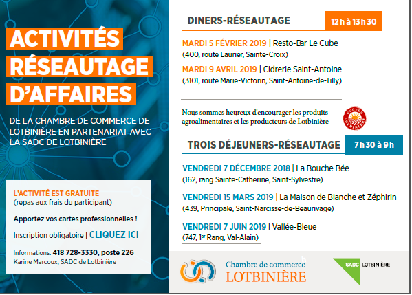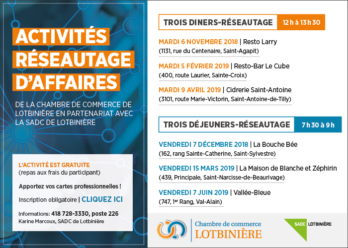 Déjeuner-réseautage d'affaires de la Chambre de commerce Lotbinière Venez rencontrer des entrepreneurs de la région, dans le cadre d’un déjeuner-réseautage d’affaires sympathique, sous forme de "Speed-dating". Apportez vos cartes professionnelles ! L’activité est gratuite (le repas est aux frais du participant). Inscription obligatoire EN LIGNE ou auprès de Karine Marcoux à la SADC de Lotbinière au 418 728-3330 […]