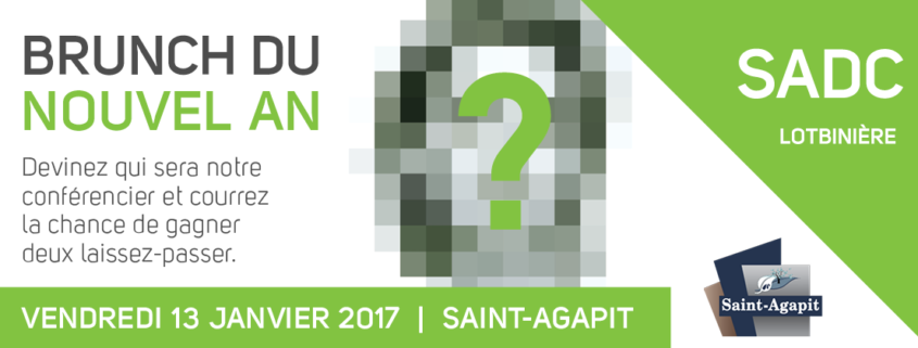 La SADC de Lotbinière et la Municipalité de Saint-Agapit invitent les citoyens et gens d’affaires de Lotbinière à tenter de découvrir qui sera le conférencier à la 5e édition du Brunch du Nouvel An. L’activité se tiendra au Complexe des Seigneuries, le vendredi 13 janvier 2017, et s’intègre dans la programmation des activités du 150e anniversaire de la Municipalité de Saint-Agapit.