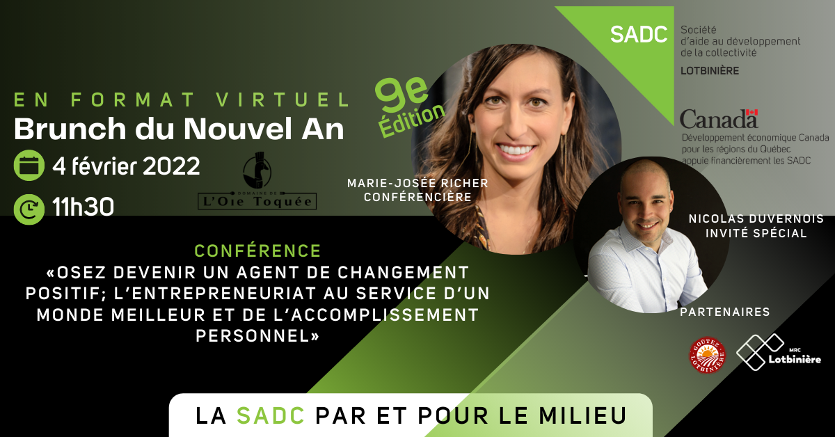 Laurier-Station, 7 février 2022- Pour la 9e édition de son Brunch du Nouvel An, la Société d’aide au développement de la collectivité (SADC) de Lotbinière a opté pour une formule virtuelle de leur traditionnel Brunch. Pour l’occasion, la SADC a reçu madame Marie-Josée Richer, Propriétaire et cofondatrice de PRANA à titre de conférencière et Nicolas Duvernois, PDG – Duvernois Esprits Créatifs (PUR Vodka, romeo’s gin et Choco Crème).