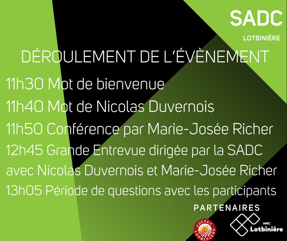 Cette activité est rendue possible grâce à la contribution financière de la SADC de Lotbinière et du gouvernement du Québec.