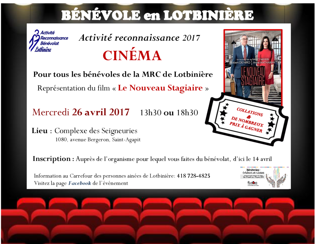 RECONNAISSANCE DES BÉNÉVOLES: CINÉMA GRATUIT LE 26 AVRIL